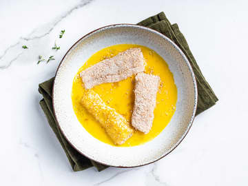 4. Ha de meldekkede fiskestykkene i eggblandingen. Få godt med egg på begge sider.