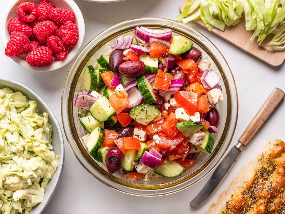 Vår greske salat med fetaost, agurk, rødløk, oliven og saftige cherrytomater er en tidløs favoritt som passer til det meste! Server den gjerne sammen med kylling, hvit fisk eller noe fra grillen.