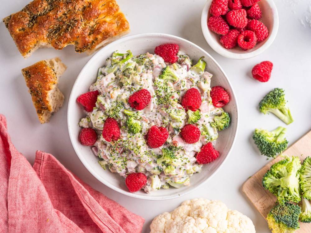 Vår brokkolisalat er så god at alle skal få nyte den! Derfor har vi laget en variant uten bacon, og heller vendt inn saftige, søte bringebær for en frisk og fruktig vri.