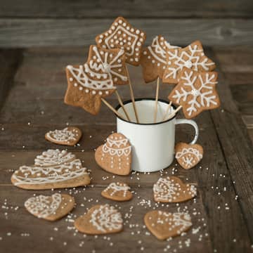 Du stikker en grillpinne av tre i pepperkakene før de stekes. Etterpå kan du pynte dem med melisglasur og strøssel etter ønske.