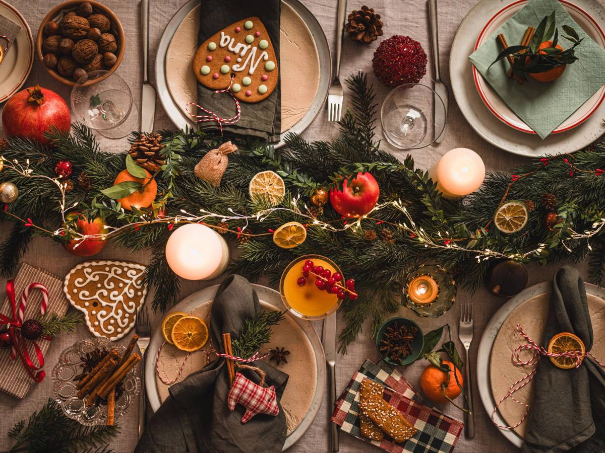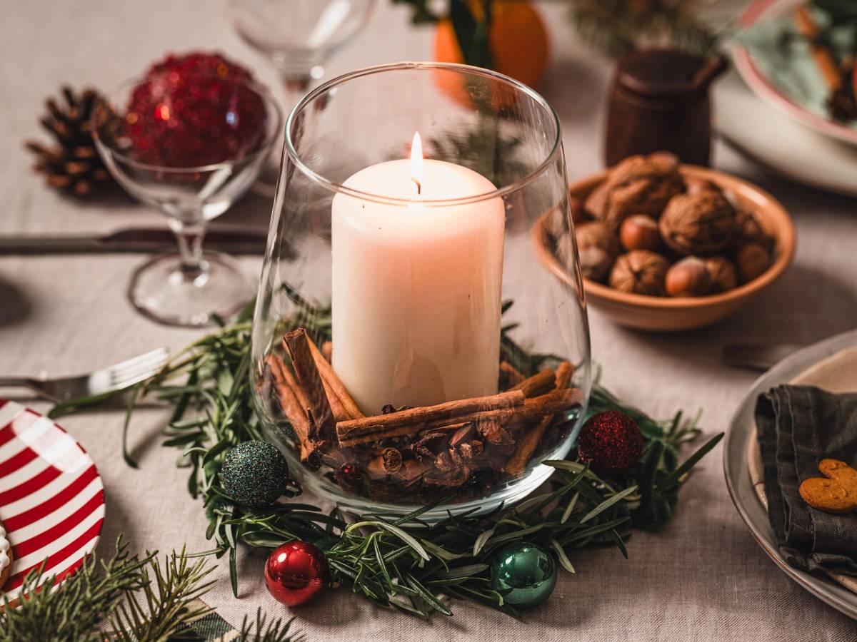 Et stort glass kan bli en vakker lykt til bordet. Sett et kubbelys i glasset og pynt rundt med kanelstenger, granbar eller litt tørket frukt. Det gir et varmt uttrykk og passer perfekt som borddekorasjon gjennom hele julen.