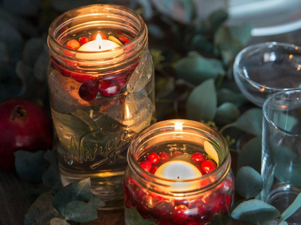 Har du krukker eller Norgesglass som er mindre i strørrelse? Fyll dem med pynt som bær, granbar eller krydder før fyller dem med vann. Sett et telys på toppen, og du får små, stemningsfulle lykter!