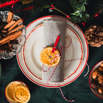 Tørkede appelsinskiver gir en frisk og naturlig detalj. Fest en skive til servietten med hyssing eller en liten klype, og du får enkel pynt som dufter jul og ser dekorativ ut på tallerkenen.