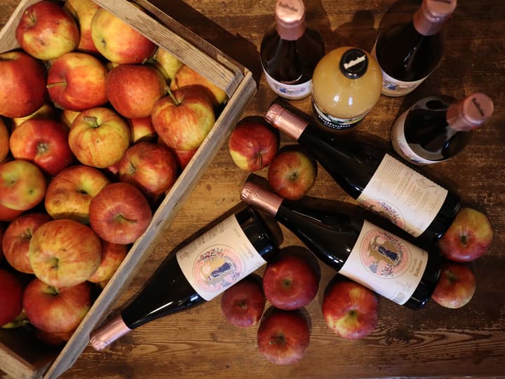 I den vakre frukthagen steller familien noen tusen trær med 60 ulike eplesorter, åtte pæresorter, et førtitalls plommevarianter, aprikos, kvede, mispel, ulike saftige bær og ikke minst rabarbra. Den planter de mellom epletrærne, både for å utnytte plassen og holde ugresset borte.