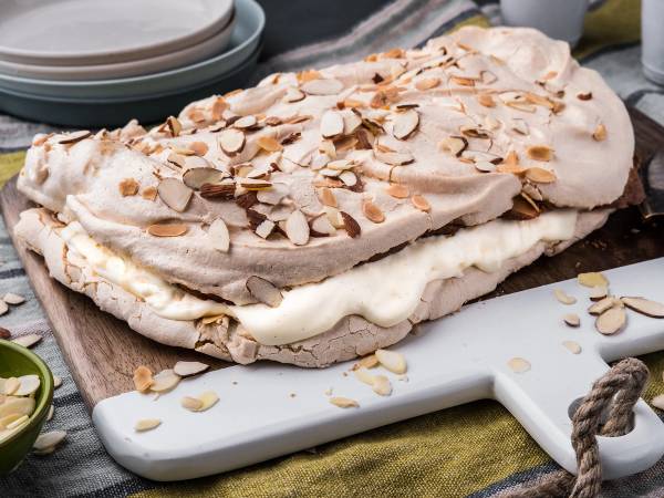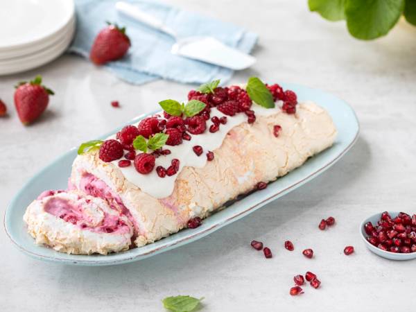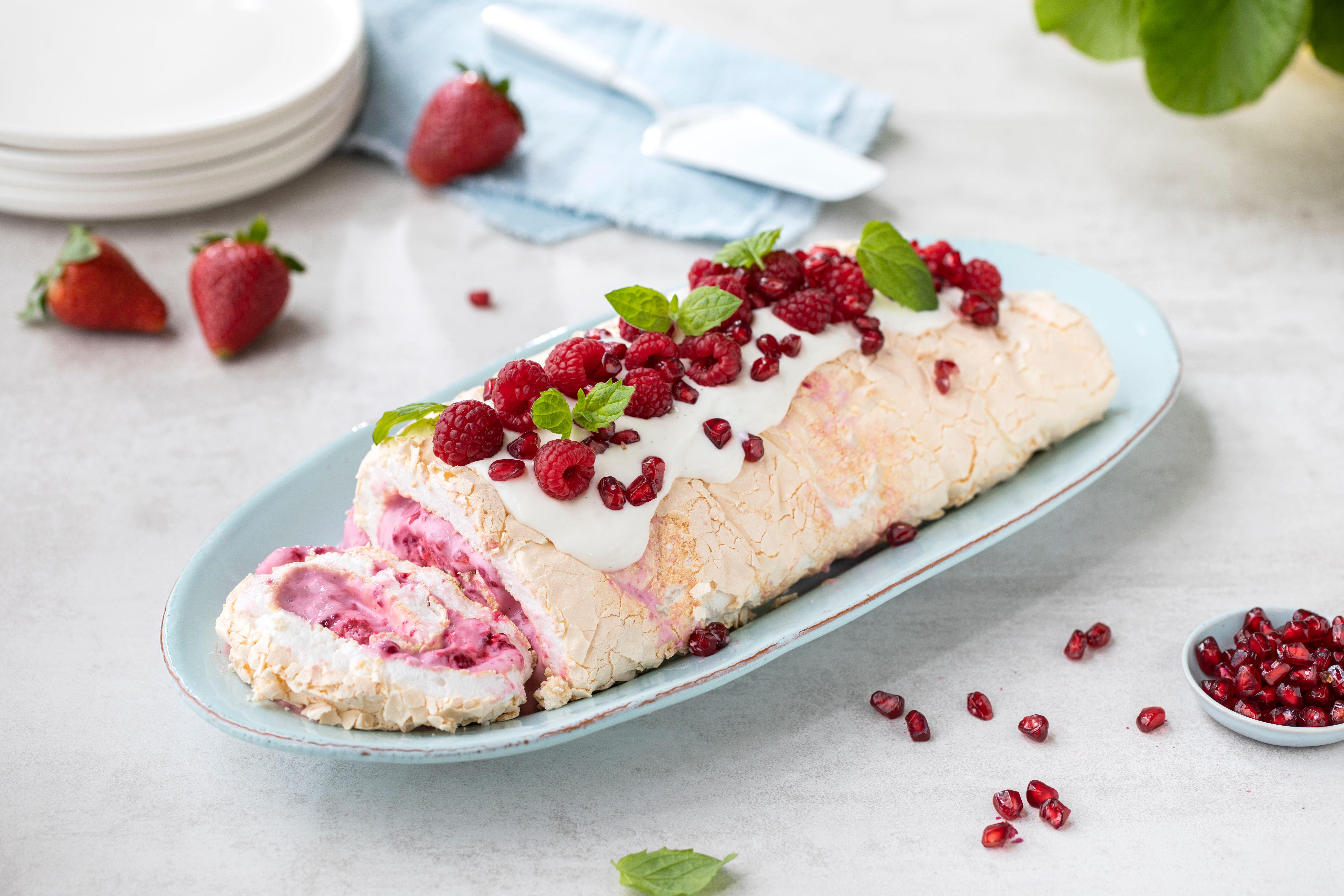 Oppskrift på pavlovarull med vaniljekrem og friske bær. En klassisk pavlovakake med en vri - denne blir garantert populær på kakebordet! Perfekt dessert til 17. mai, sommerfest eller bursdag.