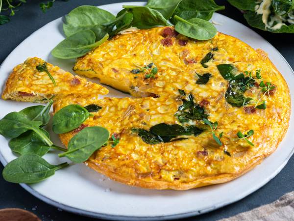 Oppskrift på smakfull bondeomelett, eller fransk omelett, med chorizo fra Ask gård, Bufarost, løk og spinat. Dette er en rask og enkel omeletten som passer fint å servere til både frokost og lunsj. Bruk gjerne lokale Matskatter i denne retten.