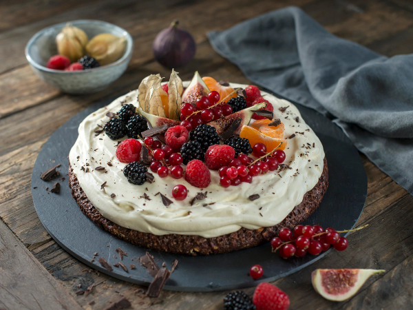 Nydelig kake med bunn av mandler, eggehviter, melis og kakao, toppet med vaniljekrem og friske bær. En vakker dessert når du har gjester til middag eller til bursdagsfeiring. Glutenfri.