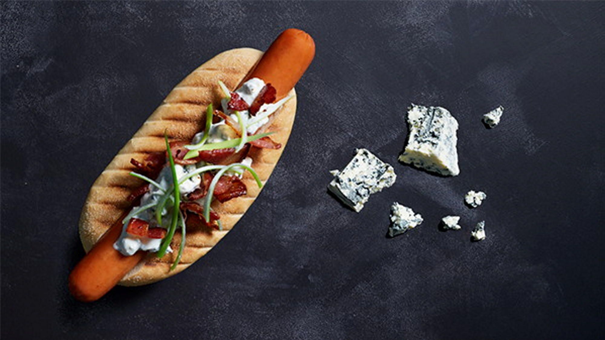 - Topp pølsa med blåmuggostkrem, bacon og vårløk.