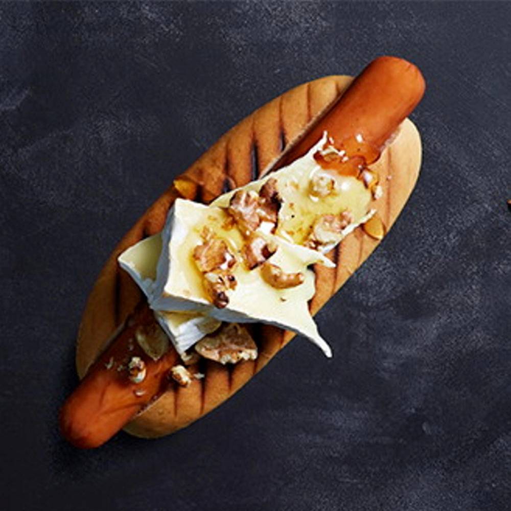Med lun brie, honning og valnøtter er dette en skikkelig fristelse på pølsa.