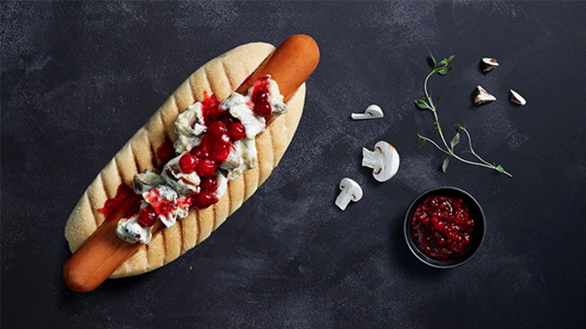 - Topp pølsa med soppblandingen og litt tyttebærsyltetøy.