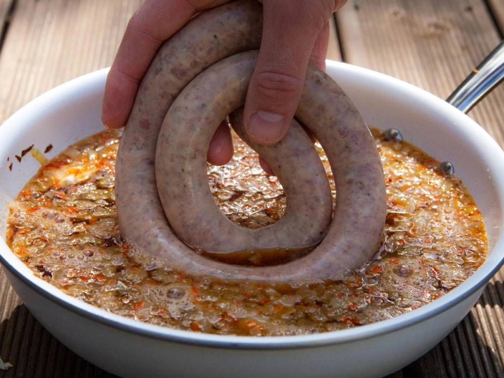 - Senk varmen og la pølsene steke videre til de er gjennomvarme.