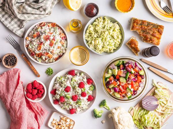 Vi elsker friske og fargerike salater hele året, men spesielt nå på våren og sommeren. Tenk hele regnbuen og bland grønn salat og avokado med røde tomater og bær, gul ananas og mango og oransje fersken og gulrot. Vi gir deg oppskrifter på store middagssalater og enkelt tilbehør.