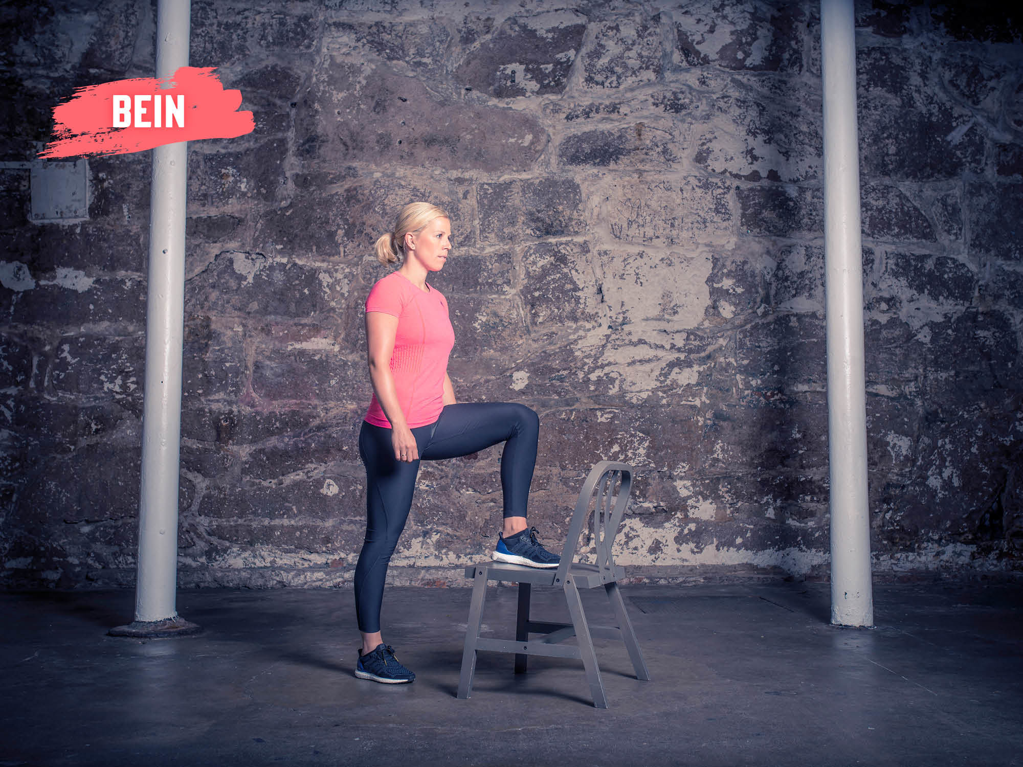 Ett og ett bein skal jobbe. Plasser et bein på en stol eller kasse. Jobb deg opp og løft fremre bein foran deg uten å miste balansen. Senk deg rolig ned igjen. Her vil du kjenne det godt i legger, lår og rumpe. Gjennomfør 3 runder med 10 repetisjoner på hvert bein.