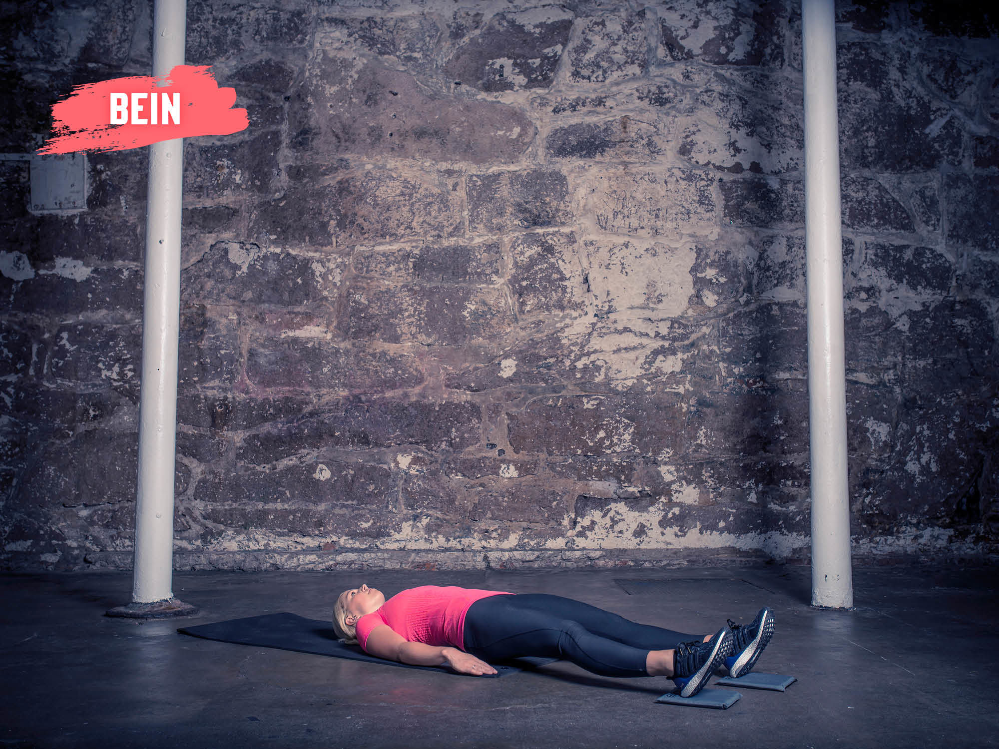 Legg deg på ryggen med føttene oppå sklimattene. Løft opp rumpa samtidig som du trekker sklimattene mot deg med hælene så nært du klarer. Senk kroppen og skyv sklimattene tilbake igjen til utgangsposisjon. Rumpa skal ikke være nedi bakken. Gjenta i kontrollert tempo.