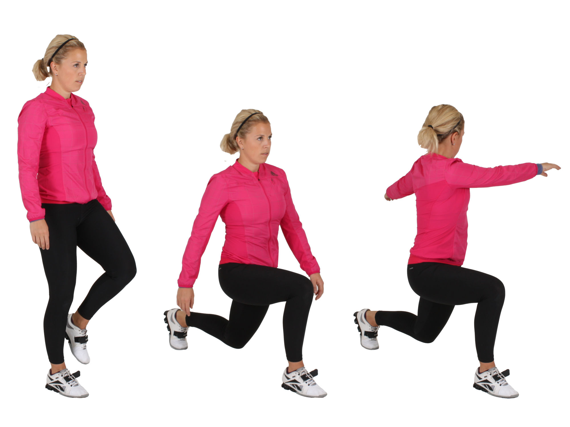 Hvordan: Stå oppreist. Ta et skritt bakover, og roter overkroppen mot siden, her vil setet og rygg få en strekk. Gjenta 5 ganger per bein.