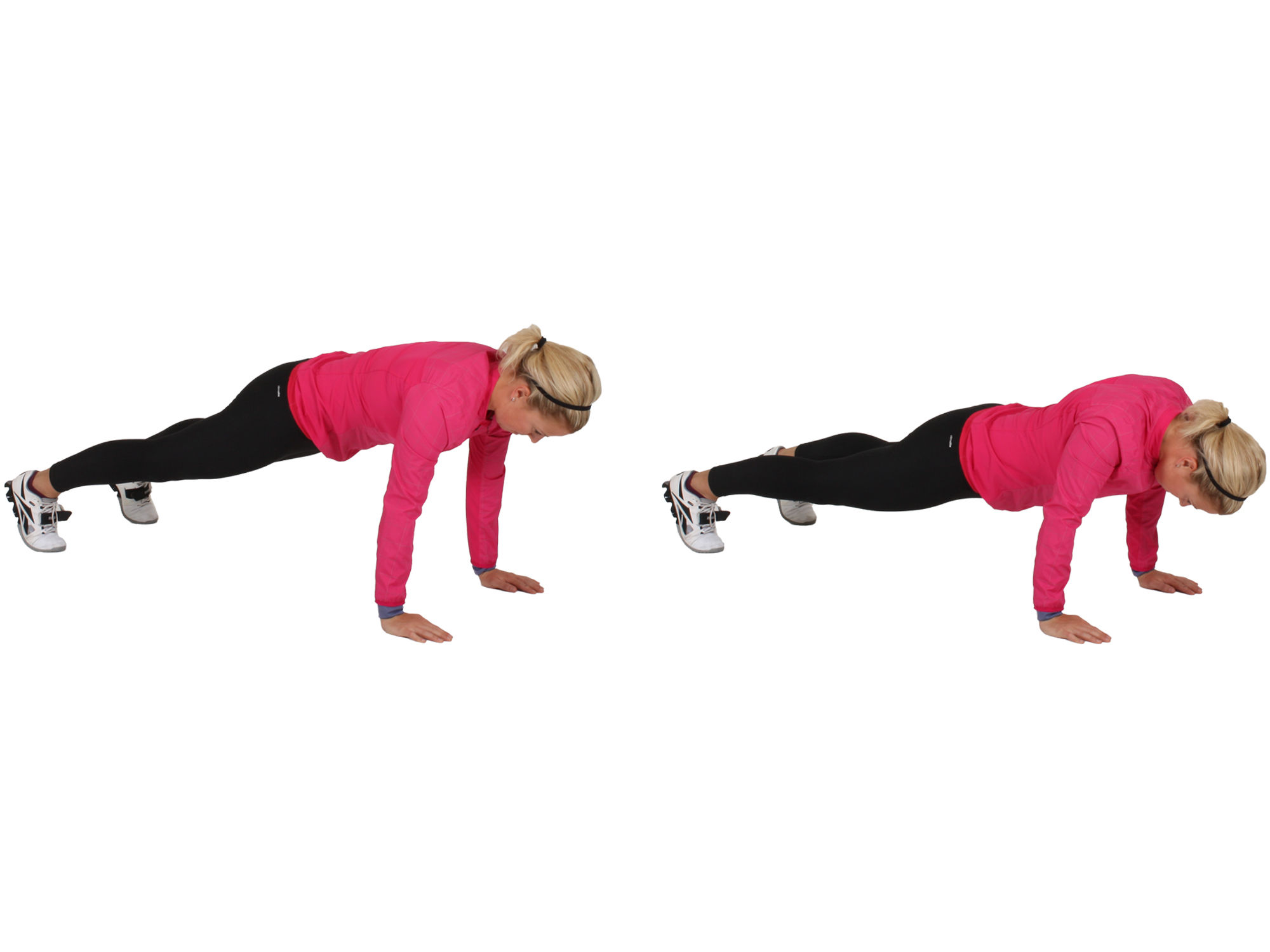 Hvordan: Stå i en høy planke med rette armer. Spenn kjernemuskulaturen så du unngår å svaie for mye. Press skulderbladene sammen, så avstanden mellom dem minker, uten å bøye albuene. Er dette vanskelig kan du begynne med å stå på alle fire. Gjenta 10 ganger.