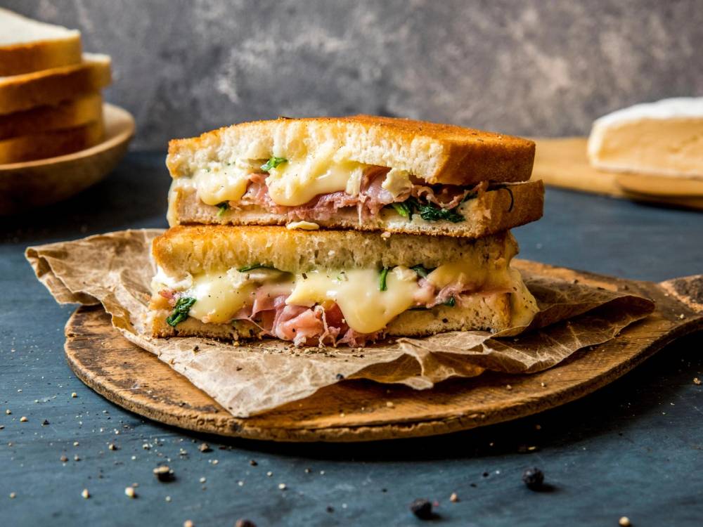 - Legg skinke og ost på en brødskive og legg en ny brødskive på toppen.